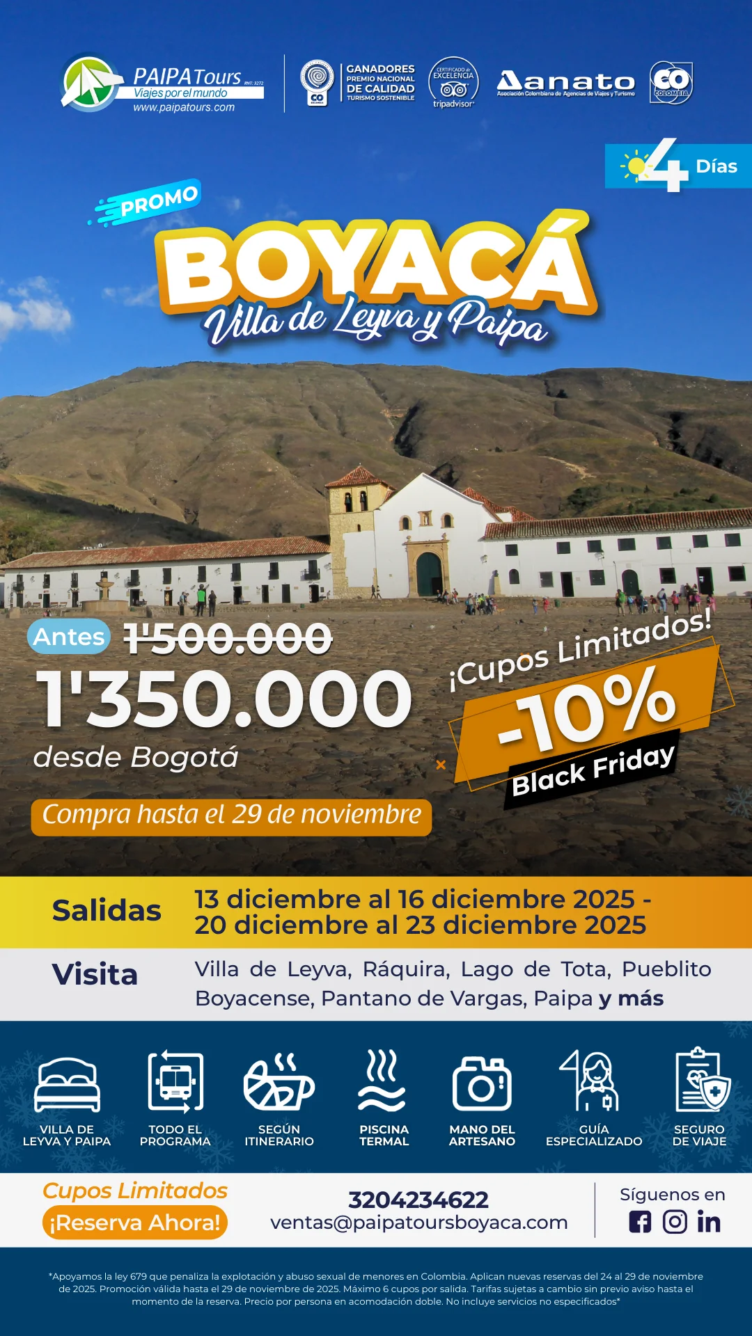 Contáctanos: 320 423 4622 – 314 389 7051 / ventas@paipatoursboyaca.com