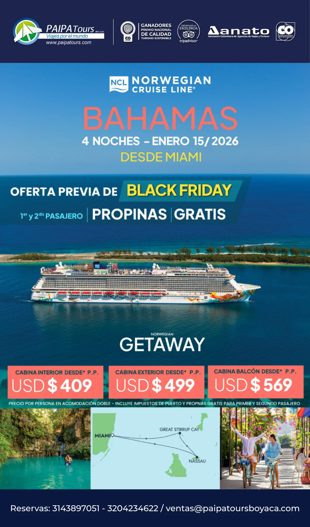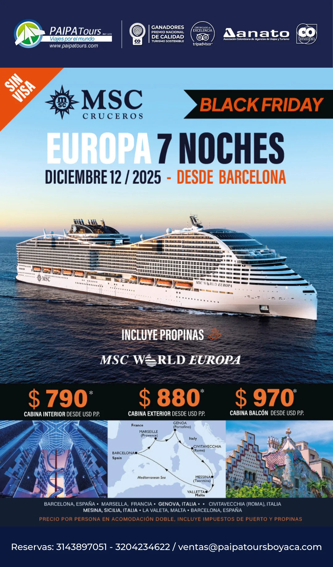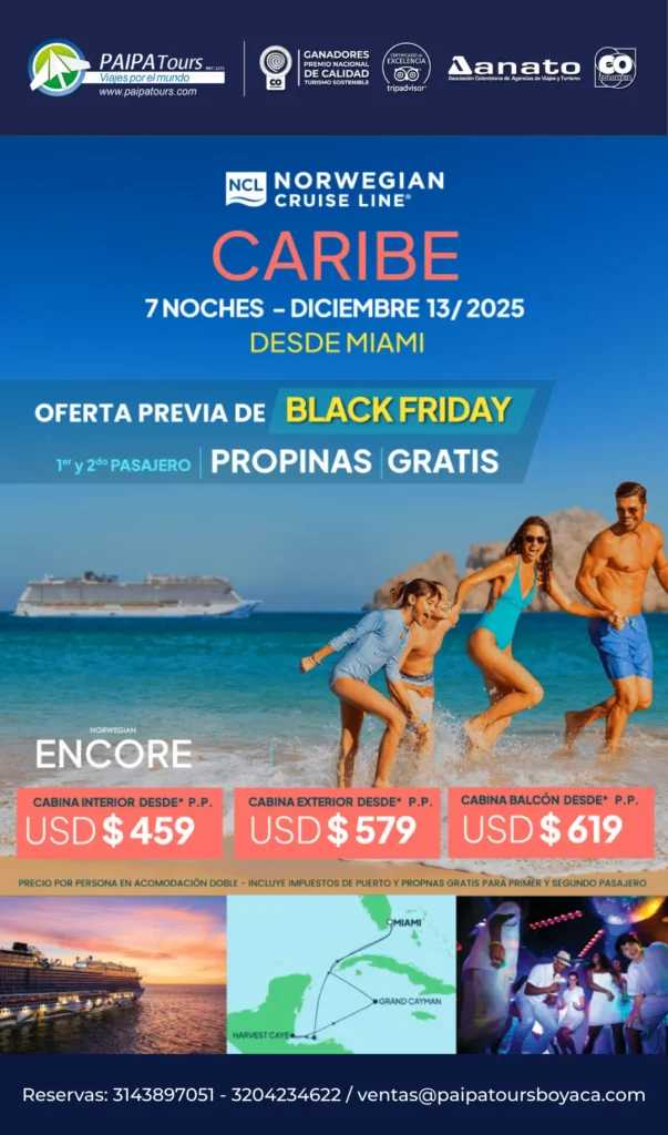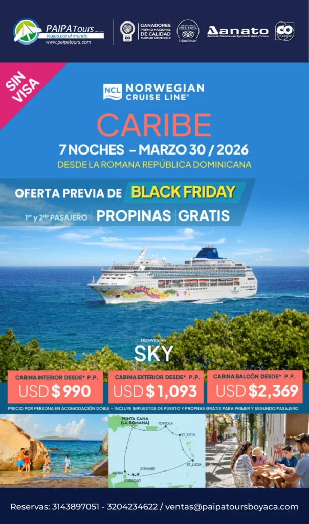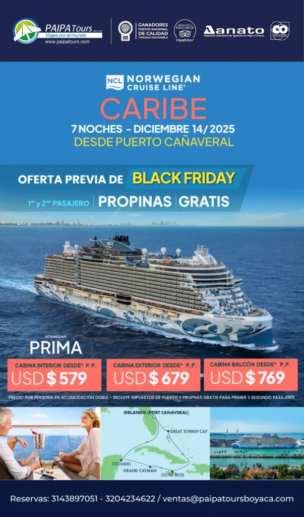 Aprovecha las mejores ofertas en cruceros durante el Black Friday 2025 y reserva tus vacaciones soñadas al mejor precio. Encuentra descuentos únicos en rutas por el Caribe, Mediterráneo y Norte de Europa con la calidad y respaldo de Paipa Tours. Esta es tu oportunidad para viajar en crucero en 2025 y 2026 con tarifas especiales. ¡Reserva Ahora!