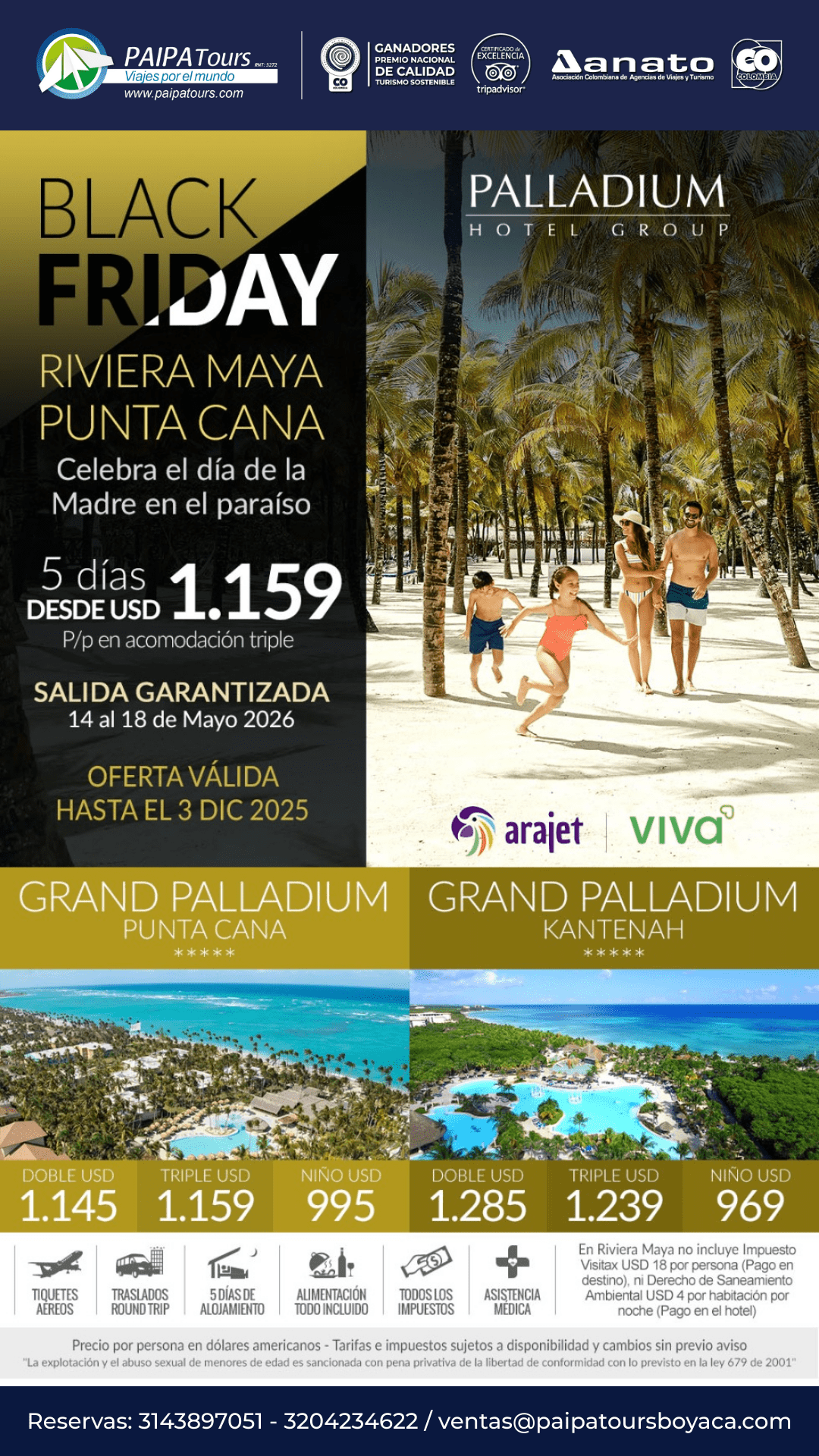 Aprovecha nuestras promociones Black Friday y asegura tus vacaciones soñadas al mejor precio. Descuentos exclusivos por tiempo limitado. ¡Reserva hoy y viaja en 2026!