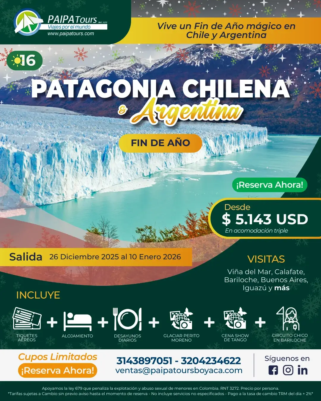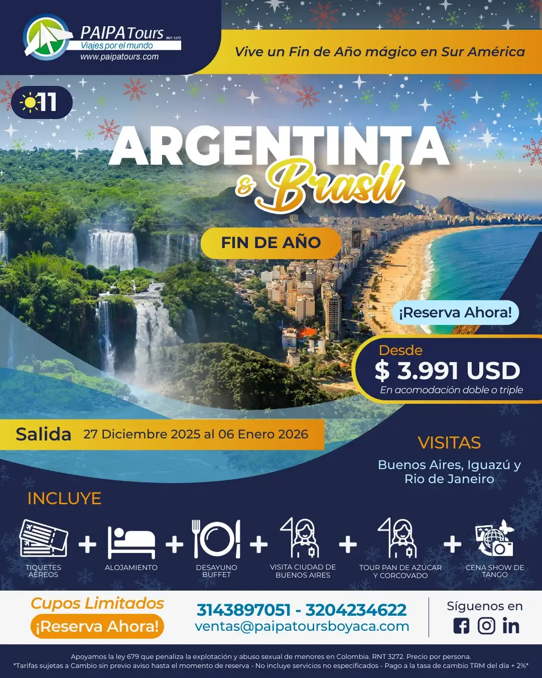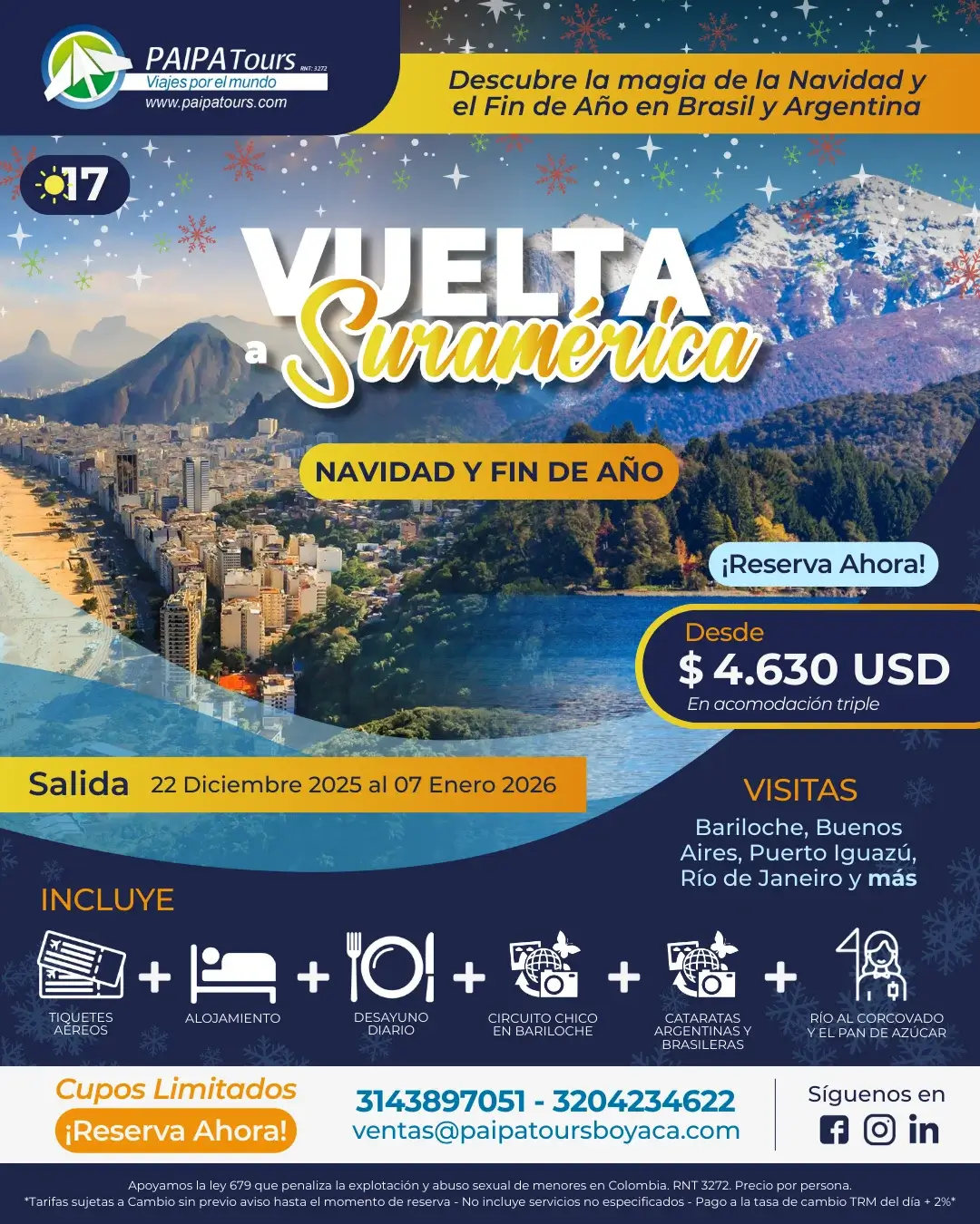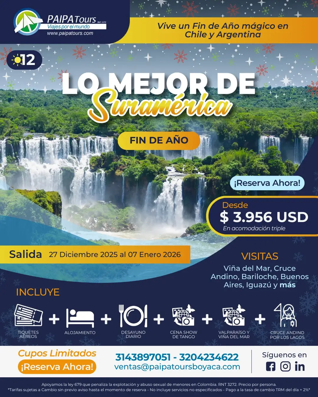 ¿Quieres celebrar el Fin de Año en destinos llenos de cultura, paisajes impresionantes y fiestas inolvidables? Nuestros viajes a Suramérica para Fin de Año 2025 desde Colombia te llevan a descubrir lo mejor de Argentina, Brasil, Perú y otros rincones fascinantes de la región.