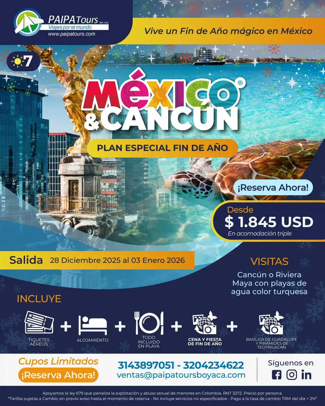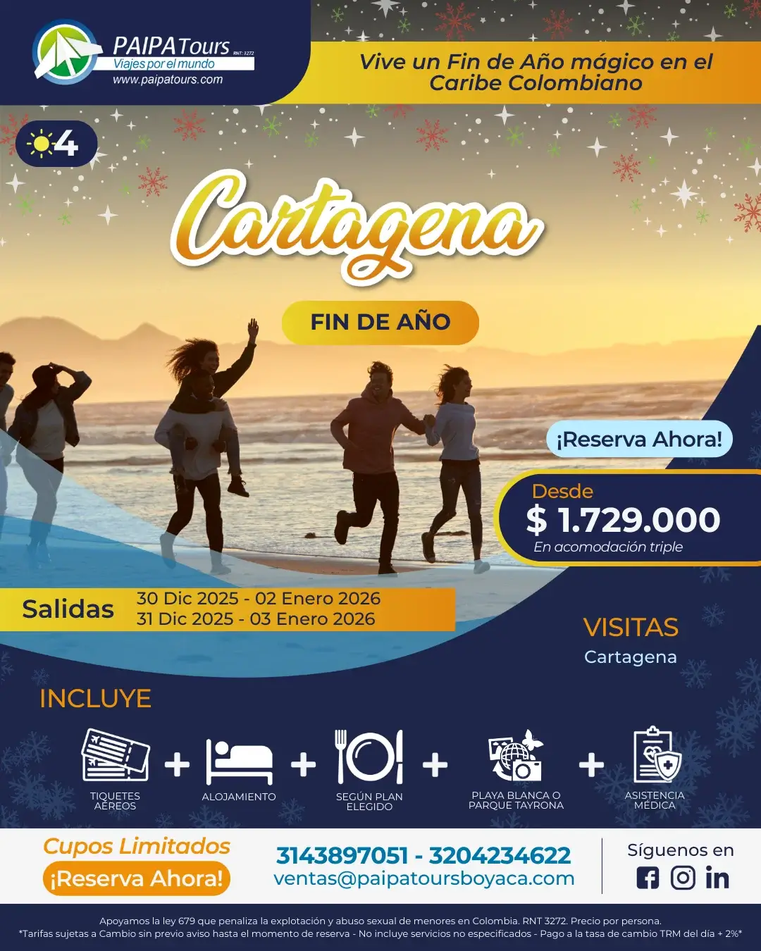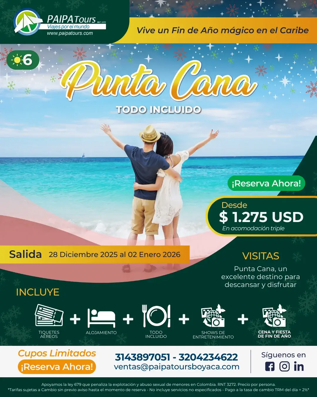 Nuestros paquetes de Fin de Año en el Caribe, México y Estados Unidos incluyen vuelos, traslados, alojamiento en hoteles seleccionados, actividades turísticas y experiencias festivas para recibir el 2026 como lo imaginaste. Con Paipa Tours, tu Fin de Año estará lleno de sol, diversión y momentos que recordarás siempre.